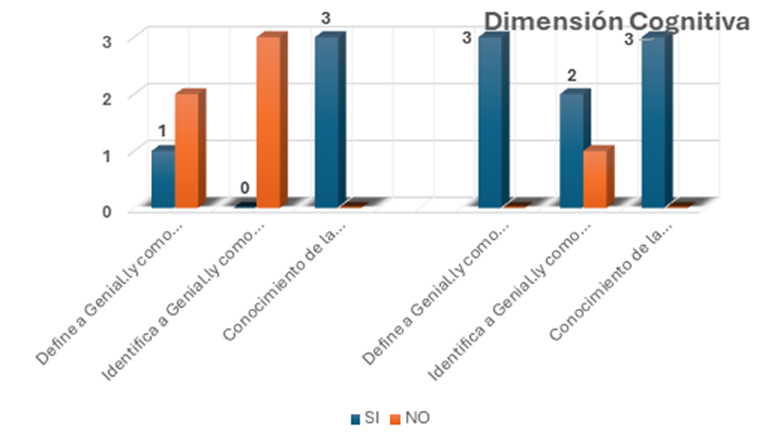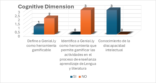 Figure 5 represents the Cognitive Dimension, showing a comparison of the knowledge before and after teacher training and the use of Genial.ly as a gamifiable tool in the teaching of Language and Literature for students with intellectual disabilities.