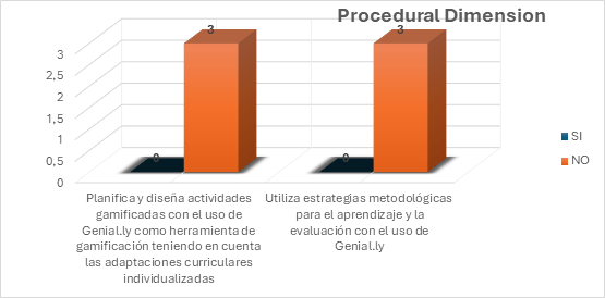 Figure 2 shows the procedural dimension, which indicates the use of Genial.ly as a tool in the planning of activities and methodological strategies in the area of Language and Literature for students with intellectual disabilities. The results showed that 100% of the participants do not plan or design gamified activities using this tool, they do not incorporate methodological learning and evaluation strategies. This indicates a large gap in its practical application.
