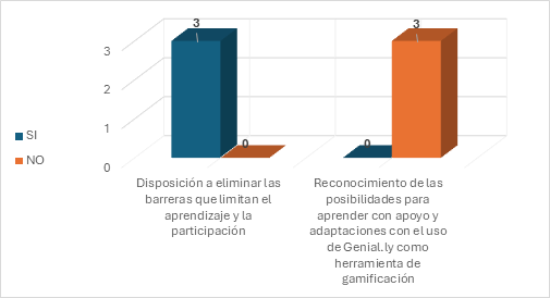 Figure 1 shows that most teachers still face challenges in defining Genial.ly as a gamifiable tool, suggesting the need to strengthen the understanding of this tool on its educational use. However, it is good to see that all participants recognize the importance of knowledge about intellectual disability, highlighting their commitment to inclusion. In summary, this result underlines that, although there are areas for improvement in the application of technological tools, there is a solid foundation of sensitivity and understanding towards the needs of students, which represents a fundamental step towards a more inclusive and adapted education.