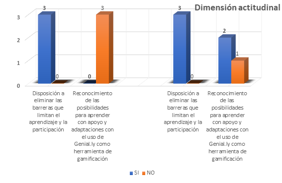 We can see Figure 7 of the Attitudinal Dimension the before and after the training. Before the training, Genial.ly was not identified as a tool to carry out activities in the classroom, now most consider that Genial.ly does contribute to the improvement of motivation and learning, knowing that the activities in the tool can also be adapted according to the individual needs of the students. All teachers are willing to apply what they have learned in the training plan for the use of Genial.ly in the classroom and encourage student participation in the different activities carried out with the gamifiable tool.