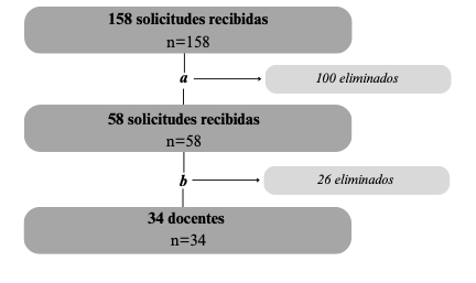 La población del estudio se conformó a conveniencia mediante una convocatoria dirigida a docentes de educación física en servicio. En primer lugar, se publicó la convocatoria en redes sociales (Facebook e Instagram), y los docentes interesados completaron un formulario de pre-registro. Se recibieron 158 solicitudes iniciales. Posteriormente, se envió un correo electrónico a las cuentas proporcionadas para formalizar la inscripción, obteniéndose respuestas de 58 personas. Finalmente, se enviaron por correo electrónico los enlaces y acceso a la sesión informativa inicial, la cual se llevó a cabo el día 5 de septiembre de 2024 con un número de 34 docentes (ver Gráfico 1).