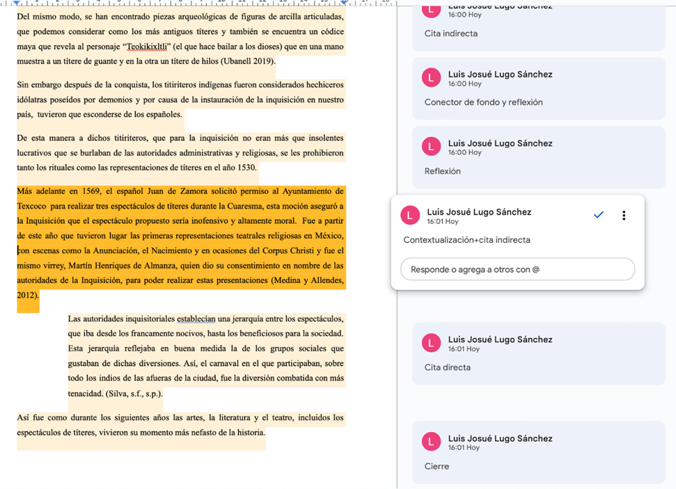 Cita directa + reflexi n: coloca un copy/paste de alg n autor (pero que est bien citado) y posteriormente reflexiona respecto a esa idea: qu te hace pensar? c mo relacionar as dicha idea a otra? Qu otra reflexi n podr as aportar? identificas alguna cr tica posible? |