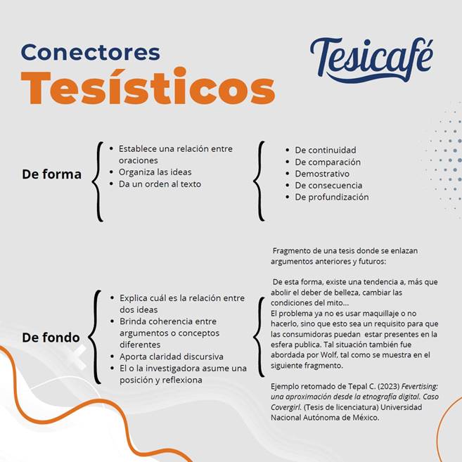 Por otro lado, se encuentran los conectores de fondo. stos se definen como la vinculaci n entre p rrafos, d ndole continuidad a ideas que expresen reflexividades por parte de las y los tesistas. Al mismo tiempo, brindan coherencia a las ideas y escritura de un proyecto. Ayuda a que exista conexi n epist mica entre planeamientos. Conectan ideas, no s lo est ticamente, sino en el trasfondo. Implican una posici n y reflexividad del investigador. Aunado a que proyectan una postura ontol gica, epistemol gica y axiol gica. M xime cuando posicionan el expertise del autor. En particular, responden a las preguntas: qu liga a una idea con otra? Por qu X Y y Z conceptos se conectan? C mo mediar mi discurso entre A y B ideas? Si no se usan conectores de fondo, se mezclan ideas, no se entienden las elecciones epist micas, se corre el riesgo de incurrir en incongruencias epist micas y el lector queda con indeterminaciones. Del mismo modo, hay una lista con conectores de fondo que puedes utilizar: