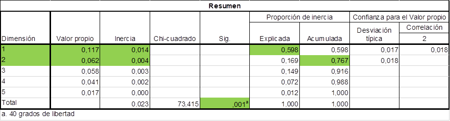 Para definir el número de dimensiones con las que se trabajó se tomó en cuenta la inercia, ya que es el estadístico que da lugar a definir las dimensiones que son necesarias para mostrar una solución. Es importante considerar la inercia acumulada, dado que la dimensión uno explica el 0,117 y la dimensión dos explica 0.062, las dos dimensiones lanzan un total de 76.7%, por lo que introducir una tercera dimensión incrementaría un 9.16% no siendo tan relevante por lo que complicaría la interpretación de los resultados al ser un plano tridimensional. Además, se puede observar que la dimensión que es de mayor importancia tiene un total de 59.8% de la información total y que la significancia es igual a 0.001 siendo menor a 0.05 por lo que se rechaza la hipótesis nula y por lo tanto existe una asociación de variables.