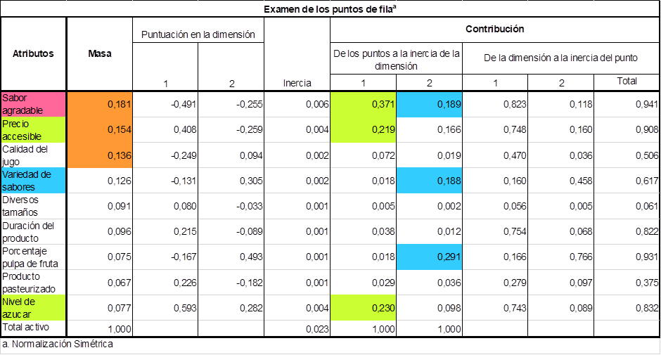 Contribución de la dimensión 2: Se puede observar que el primer eje factorial es el atributo porcentaje de pulpa, que contribuye con 29.1% de la inercia, seguido del atributo sabor agradable, que contribuye con 18.9% de la inercia y variedad de sabores, que contribuye con 18.8% de la inercia. Estos atributos son importantes en la explicación la dimensión 2, con 66.8% del 100% de la explicación. Por lo tanto, los atributos que mejor representados están en los dos ejes para la explicación de las dimensiones son: Sabor agradable, precio accesible, nivel de azúcar, porcentaje de pulpa y variedad de sabores.