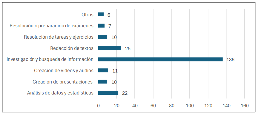 Figura 3: Esta figura muestra las actividades que los estudiantes realizan con asistencia de la inteligencia artificial, destacando entre ellas la investigación y búsqueda de información, seguida por la redacción de textos y el análisis de datos y estadísticas. En contraste, actividades relacionadas con el desarrollo creativo, como la creación de videos, audios y presentaciones, tienen una menor incidencia. Esta diferencia puede explicarse en parte porque la estructura del Prompt para las primeras tres tareas es más sencilla en comparación con la creación de archivos multimedia, que suele requerir un mayor grado de personalización. Además, muchas de estas funcionalidades creativas están sujetas a servicios de suscripción, mientras que las herramientas generativas de texto suelen estar disponibles de manera gratuita. Estos datos también guardan relación con el trabajo realizado por GAD3, sobre el uso de estas herramientas de IA que es en menor número para la creación de archivos multimedia (Planeta Formación y Universidades - GAD3, 2024). Por otra parte, resalta el uso otorgado como herramienta de investigación y búsqueda de información lo cual es más sencillo que utilizar el buscador de Google ya que existe la facilidad de dialogar con el asistente de inteligencia artificial.