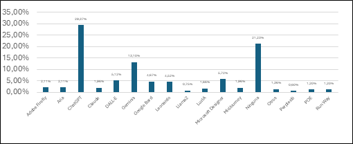 Figura 4: Dentro de esta figura se pueden observar los sistemas de inteligencia artificial más utilizados por los estudiantes que participaron en la encuesta, en el cual destaca el uso de ChatGPT como la herramienta más empleada, con un 29.37% seguida por Gemini AI con el 17.77%. Sin embargo, también llama la atención el alto porcentaje de estudiantes que seleccionaron la opción ninguna, que representa el 21.23%, lo cual también demuestra un índice con el cual se tiene que trabajar en acciones de capacitación sobre inteligencia artificial.