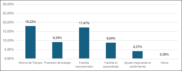 Figura 5: Este cuadro muestra las principales razones por las cuales los estudiantes encuestados recurren al uso de la inteligencia artificial. Un gran porcentaje, representado por el 18.22%, utiliza la IA principalmente por el ahorro de tiempo que ofrece. Esto es comprensible, ya que los sistemas generativos tienen la capacidad de producir textos, resúmenes y otros materiales en mucho menos tiempo del que se necesitaría para que una persona lea, analice y comprenda dicha información de manera tradicional. Por otro lado, un 17.47% de los encuestados utiliza la IA como una herramienta para facilitar la comprensión de temas complejos o que no han sido entendidos en su totalidad. Un dato notable es el 4.37% de estudiantes que señala que la IA contribuye a mejorar su rendimiento académico, lo que sugiere que el uso de estas herramientas tiene un impacto positivo en el proceso de aprendizaje.