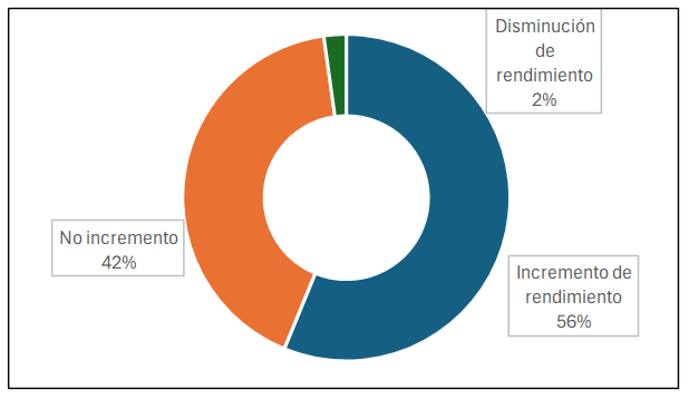 Figura 6: Este cuadro complementa la figura 4, al analizar la percepción de los estudiantes encuestados sobre el impacto del uso de sistemas de inteligencia artificial en su rendimiento académico. Un 57% de los encuestados percibe un incremento en su rendimiento académico, lo que sugiere una percepción mayoritaria de los beneficios de estas herramientas en el ámbito educativo, tal como se refleja en los sistemas descritos en la figura 3. No obstante, un 41% de los estudiantes afirma no haber notado un aumento en su rendimiento académico, lo que podría estar relacionado con factores como la falta de una integración efectiva o una capacitación insuficiente sobre los aspectos positivos de la inteligencia artificial en la educación.