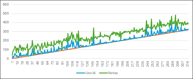 Figura 7: En complemento a la figura anterior, se observa una tendencia ascendente que sugiere que, a medida que los estudiantes hacen un mayor uso de herramientas de inteligencia artificial, sus calificaciones tienden a incrementarse. Sin embargo, esto no parece ser un factor completamente determinante, ya que el gráfico muestra picos en las calificaciones que no están siempre alineados con un uso intensivo de la IA. Las líneas de uso de IA y rendimiento académico no confluyen frecuentemente, lo que indica que un desempeño excepcional no está necesariamente vinculado a un uso frecuente y exhaustivo de estas herramientas de inteligencia artificial.