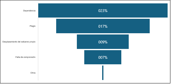 Además, un aspecto crucial del estudio es la creciente conciencia entre los estudiantes sobre los riesgos de la IA. Un 22.89% de los encuestados manifestó su preocupación por la dependencia que puede generar el uso excesivo de estas tecnologías, mientras que un 16.57% expresó inquietudes éticas relacionadas con el plagio. Estas preocupaciones son especialmente relevantes en un contexto como el boliviano, donde no existe normativa clara que regulen el uso de IA o protejan los datos personales de los usuarios, dejando expuestos a los estudiantes a potenciales vulneraciones. Esta falta de regulación no solo aumenta los riesgos asociados al uso de IA en el ámbito académico, sino que también genera incertidumbre sobre la responsabilidad y el uso ético de estas herramientas.