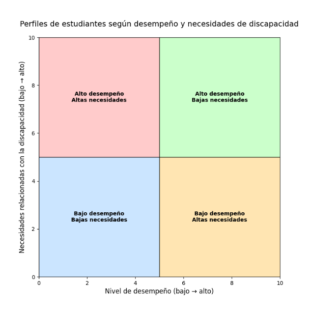 Segundo, el análisis por cuadrantes permitió identificar que los estudiantes con altas necesidades educativas obtuvieron beneficios significativos al utilizar la tecnología asistiva. En particular, aquellos con bajo desempeño inicial lograron mejorar sus resultados, lo que indica que la TAV puede actuar como un mediador que disminuya no solo barreras de acceso sino de aprendizaje, promoviendo oportunidades más equitativas dentro del aula y una evaluación más equitativa.