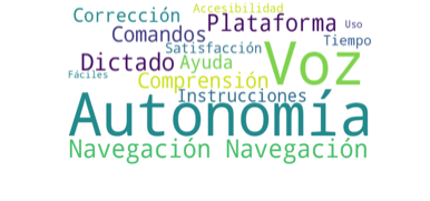 Con respecto experiencias, percepciones y opiniones sobre el uso de la plataforma de voz, lo estudiantes manifestaron algunas palabras con mayor frecuencia durante los grupos focales y la entrevista, tal como se observa la nube de palabras de la Figura 3, donde la Palabras como “Navegación” y “Autonomía” son las más grandes y frecuentes, indicando que la mayoría de los estudiantes pudo desplazarse y explorar la plataforma con independencia, aunque algunos necesitaron apoyo mínimo. Otra palabra es “Voz” lo que significa que las estudiantes sí pudieron trabajar a través de las interfaces de voz y que facilita la interacción apoyando la evaluación inclusiva y manifestaron satisfacción al interactuar con la plataforma que propicia accesibilidad a los estudiantes con discapacidad.