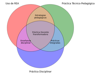 En la Figura 5, se observa en el centro del diagrama se configura la práctica docente transformadora, entendida como el resultado de la convergencia entre el uso significativo de los REA, la innovación pedagógica y la aplicación disciplinar del conocimiento. Desde esta perspectiva, el diagrama refuerza la conclusión de que la transformación de la práctica docente no depende únicamente del acceso a recursos educativos abiertos, sino del uso pedagógico intencional y de la integración coherente en los procesos de enseñanza y aprendizaje, así como el apoyo de políticas institucionales y estrategias que involucren la formación permanente y actualización de los docentes que tengan acceso a los repositorios y logren diseñar sus entornos de aprendizaje para lograr una práctica transformadora que conlleve a mejorar la calidad educativa.